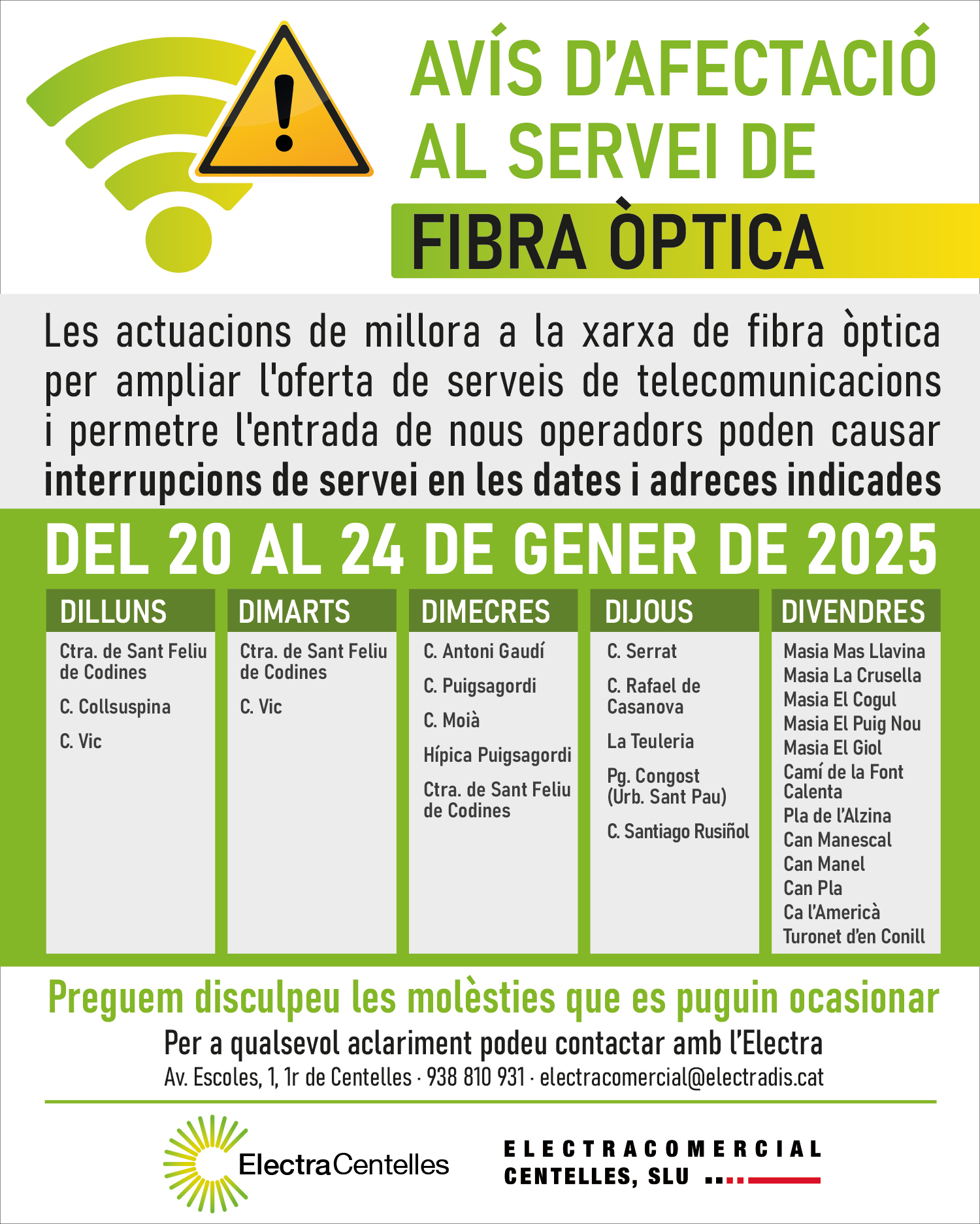 » Avís d’afectació al servei de fibra òptica del 20 al 24 de gener de 2025